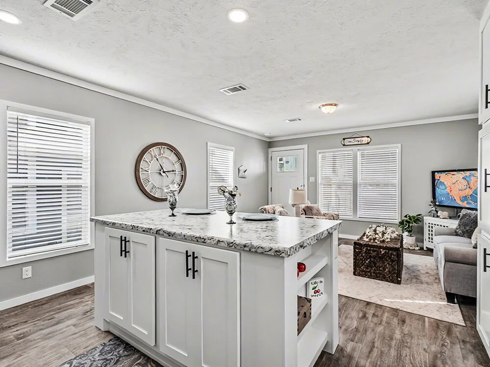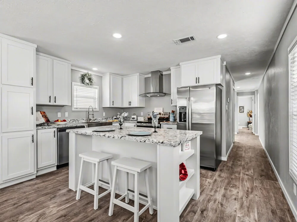 Introducing the Epic Experience line. Open living area with a beautiful oversized island. Perfect for hosting your family and friends. Come check out our closeout stock model.